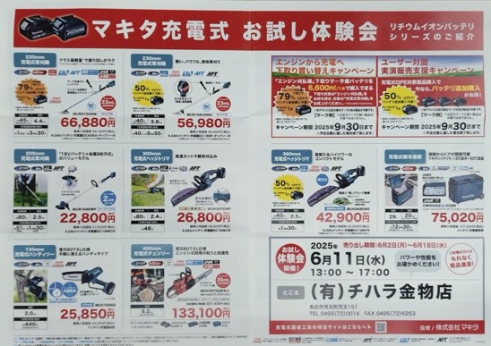 お知らせ「6/11(水)マキタ充電式 お試し体験会開催🎆【有限会社チハラ金物店】」