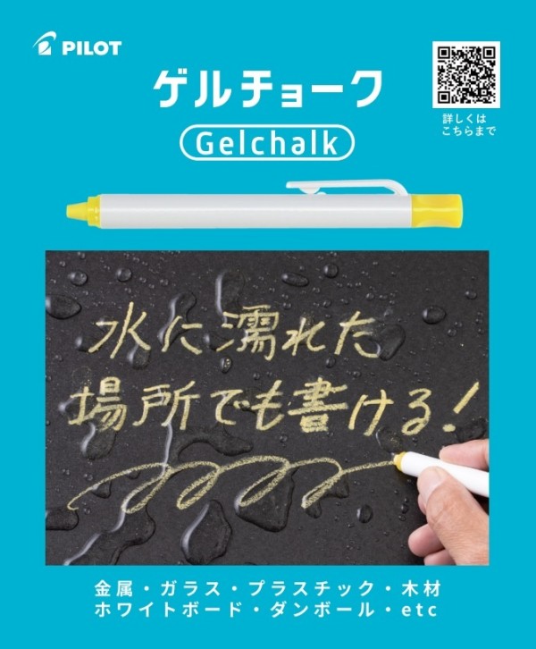 筆記具製造のコア技術を活用して、筆記具以外の市場や業界に向けた各種製品の製造・販売をしており、その中で何にでも書ける「ゲルチョーク」は、素材を選ばず、平滑な面であれば水や雨に濡れたところにも簡単に書き消しが出来る固形マーカーです。