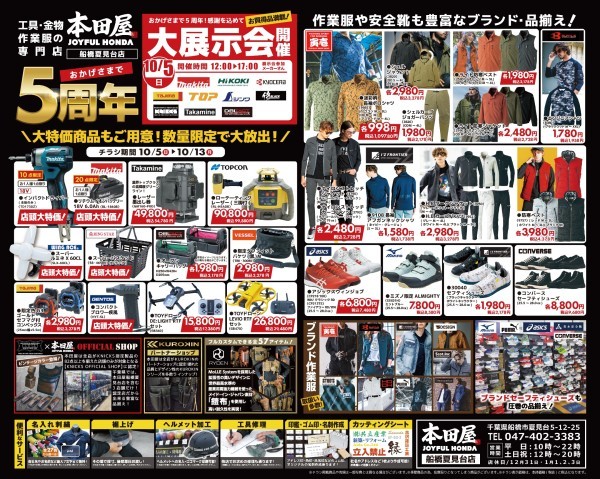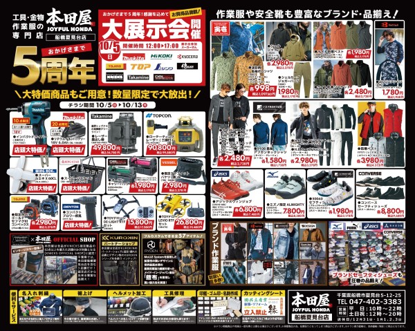 お知らせ「㊗️5周年㊗️大展示会&SALE開催!【本田屋 船橋夏見台店】」
