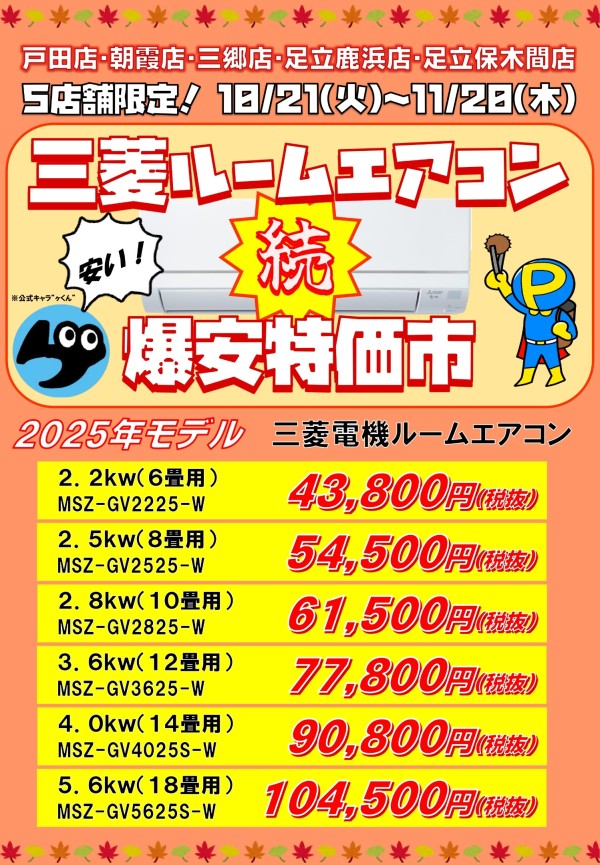 三菱ルームエアコン 爆安特価市開催中!