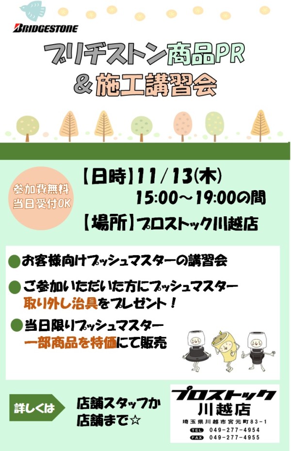 お知らせ「🎉参加費無料・プレゼント有🎉 ブリヂストン施工講習会開催🧑🏫❤️🔥【プロストック川越店】」