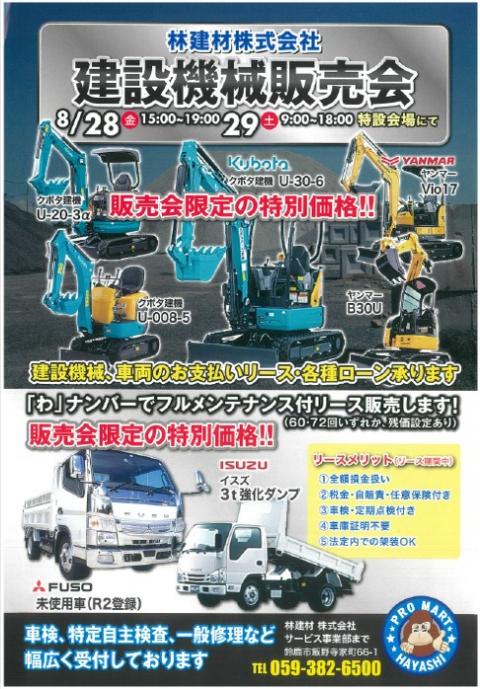 8月28日(金)・29日(土)に開催の「建設機械販売会」につきましては、