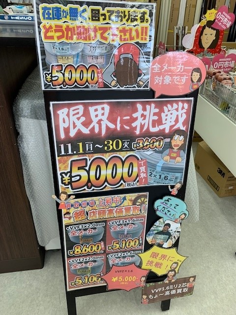 電線VVF1.6ミリ2芯の在庫がないんです。。。