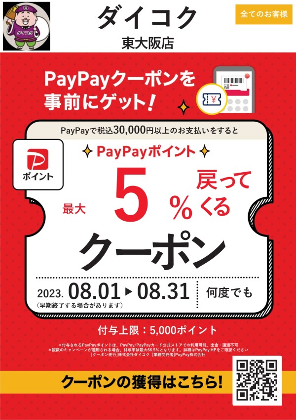 ダイコク東大阪店でご購入の方はさらに5%追加で最大25%還元されますよ(上限や条件有)