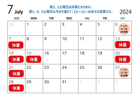 第1・4・5 土曜日は7:15~12:00の営業になります。