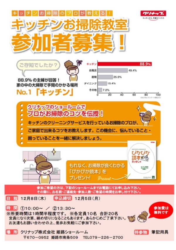 さらにさらに、12月8日は年末の大掃除に役立つキッチンのお掃除教室を開催!