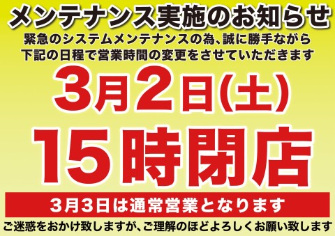3月2日(土曜日)はプロストック全店におきましてメンテナンス実施の為