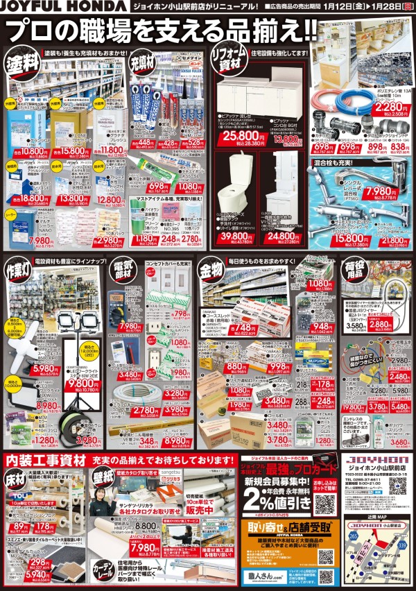 各種業務用塗料や充填剤、作業灯やコードリール・電気工事に必要な電気部材、金物、荷役用品、流し台や洗面化粧台・便器や混合栓などの住宅設備、壁紙・床材などの内装資材まで必要なものが一度に揃う充実の品揃えで職人様を徹底応援!