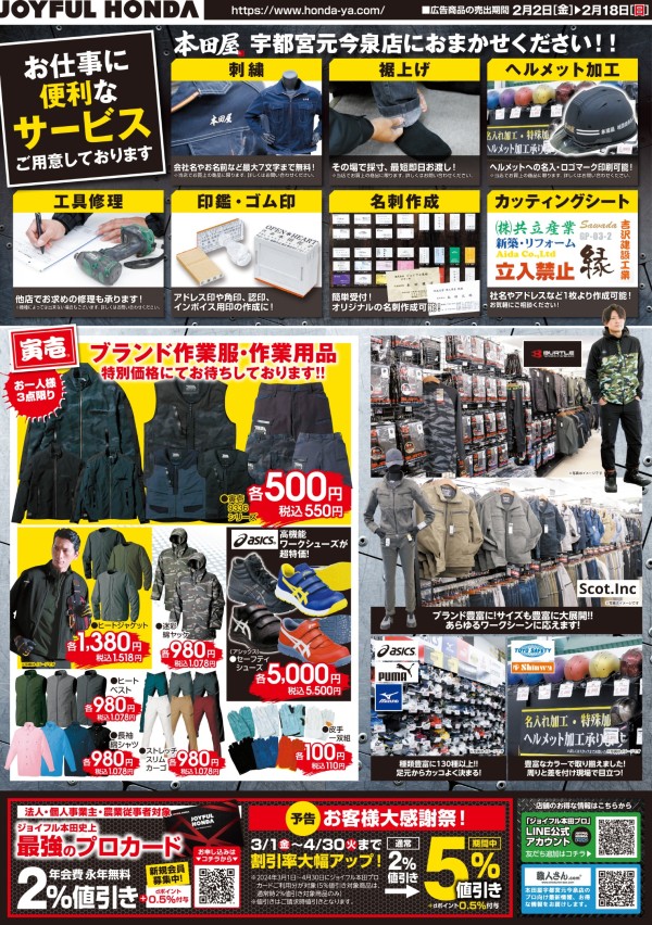 作業服への刺繍名入れ、ズボンの裾上げ、ヘルメット加工、工具修理、印鑑・ゴム印作成、名刺作成、カッティングシート加工など、お仕事に便利な各種サービスも承っております!