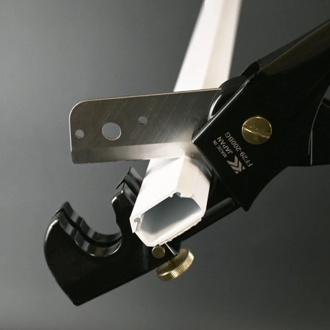 レール上の目印に受け部をそろえて固定することで外形φ25~27、モールは0~2号の切断が出来ます。