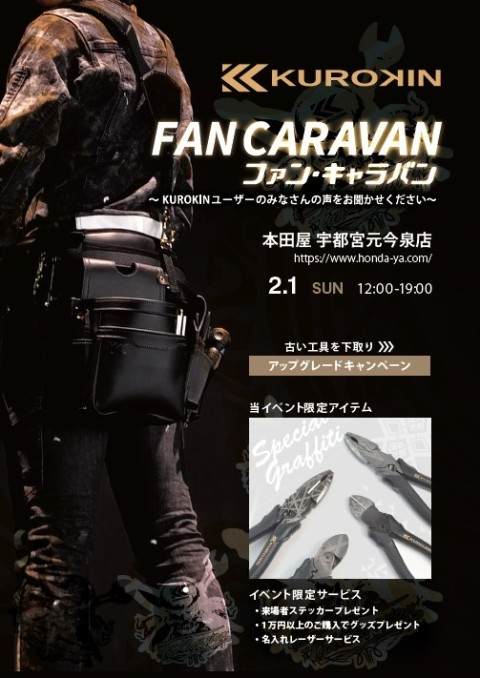 2月1日にはKUROKINファンキャラバンイベントを開催予定で、ファンキャラバンイベントでしか買えない商品や、ご購入いただいた商品にレーザー加工を施したりと特別なイベントが盛りだくさんとなっています!