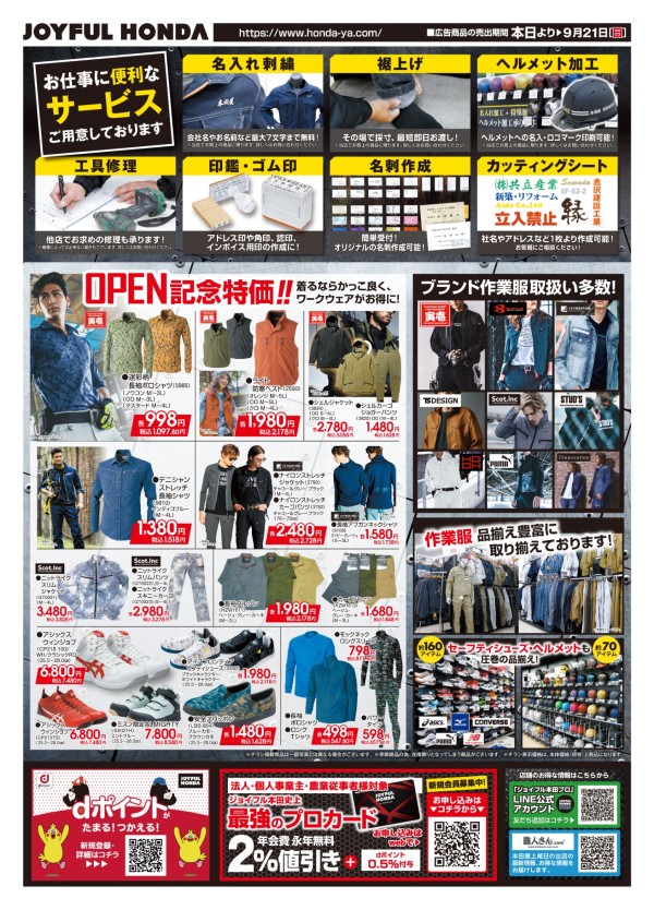 プロショップならではの職人目線の充実の品揃えとこだわりのラインナップに加え、作業服への刺繍名入れ、ズボンの裾上げ、ヘルメット加工、工具修理、印鑑・ゴム印作成、名刺作成、カッティングシート加工など、お仕事に便利な各種サービスも承っております!