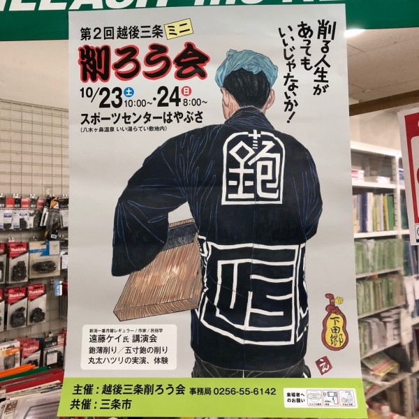 埼玉県本庄市の(有)チハラ金物店です。第2回越後三条ミニ削ろう会が10/23(土)・24(日)の2日間、新潟県三条市のスポーツセンターはやぶさで開催されます。世話人である道心斎正行さんも、五寸鉋を引っ提げて当日削りに挑まれます。道具と技が生み出す究極の仕上がりに、きっと魅了されることでしょう。お時間ある方は是非お越しください。お待ちしております。