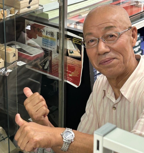 玄能のケースを覗き込む眼光鋭いスキンヘッドのお客様。