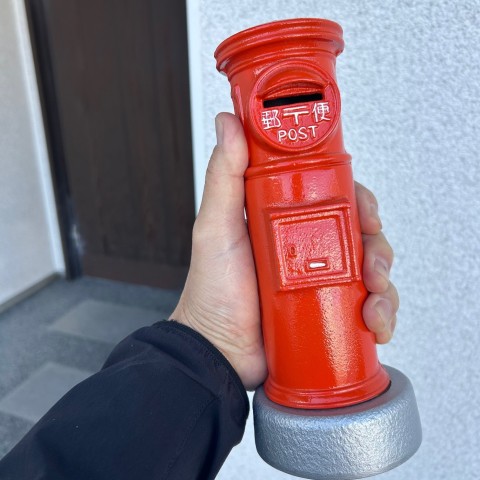 鋳物でできた貯金箱。本物の1/7の縮尺の大きさで、500円玉で10万円分貯められます。さて、何を買いましょうか。高さ23cm、重さ1.75㎏、郵便ポストそのものミニ。