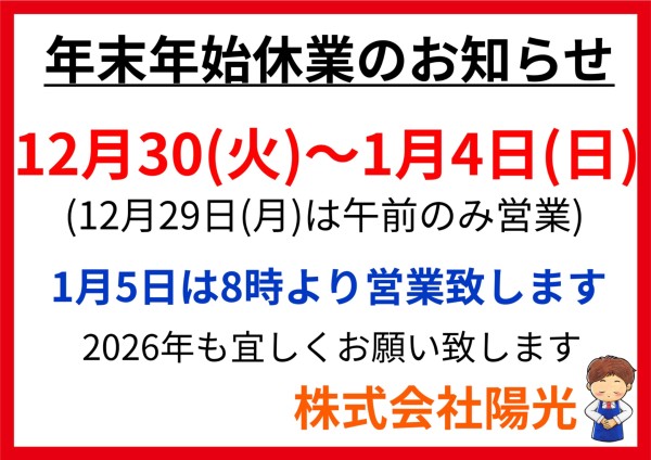 年末年始休業のお知らせです。