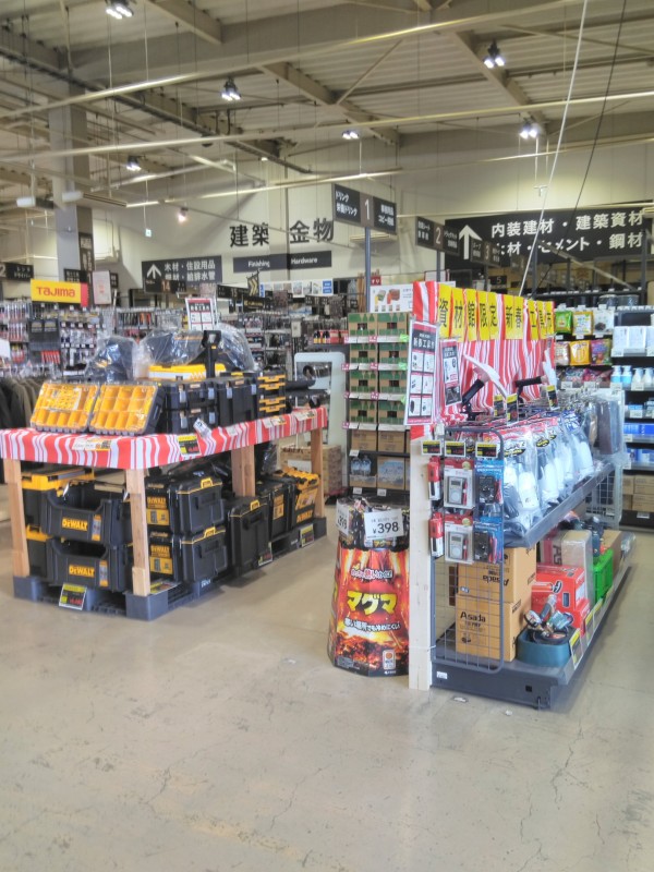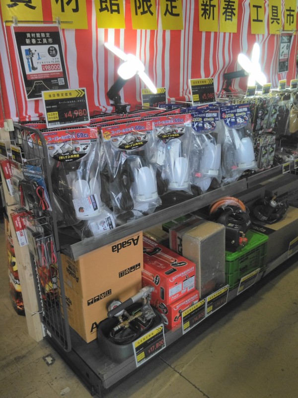 12/23(土)より当店入口特設コーナーにおきまして資材館限定新春限定工具市を開催しております。今回は配管、特に給排水関連の工具を数量限定大特価にて販売致しております。その他、屋外作業に必要な投光器、今話題の羽根型LED投光器二種類も新春大特価にて販売中です。ご興味ご関心のあるお客様はこの機会に是非当店までご来店をお待ちしております。