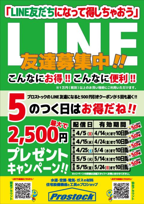 LINE友達になって頂いたお客様に500円クーポンをプレゼント!4/5(日)、4/15(水)、4/25(土)、5/5(火)、5/15(金)の計5回配信されます。最大で2500円お得ですー