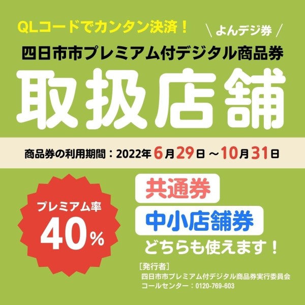 下記の特設サイト『四日市市プレミアム付デジタル商品券』にてご確認ください。