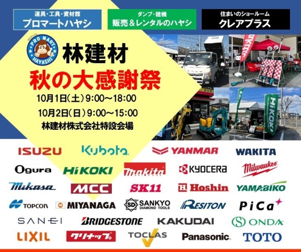 林建材では10月1日(土)・2日(日)に 、恒例の『秋の大感謝祭』を開催します!